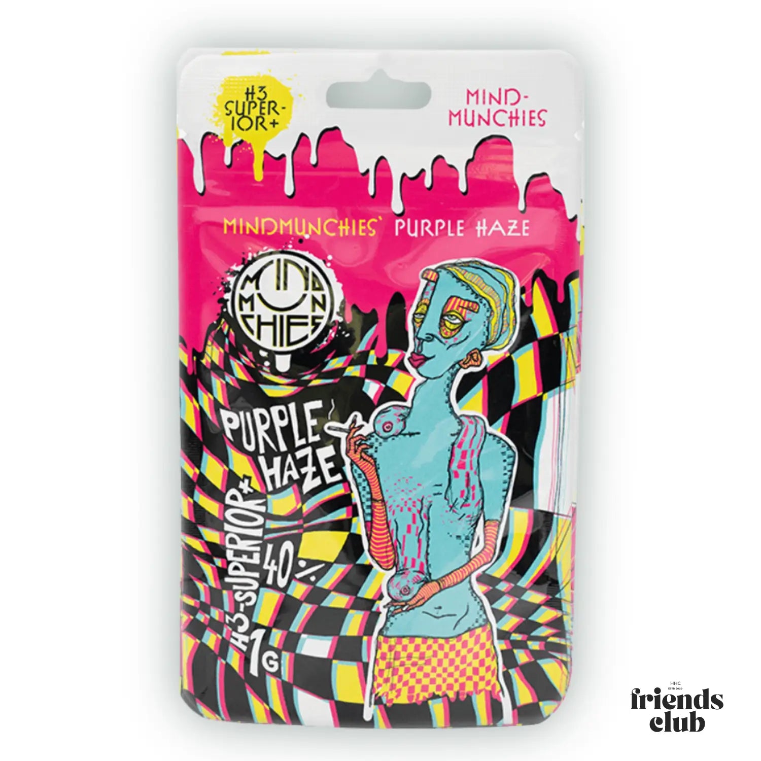 Mit psychedelischem Design und kraftvoller Rezeptur bringt „Purple Haze“ aus der Mind Munchies Serie ein dekoratives Highlight mit intensivem Aroma. Die Mischung enthält 40 % H3 Superior+ und ist ausschließlich für den aromatischen oder sammlerischen Gebrauch vorgesehen.