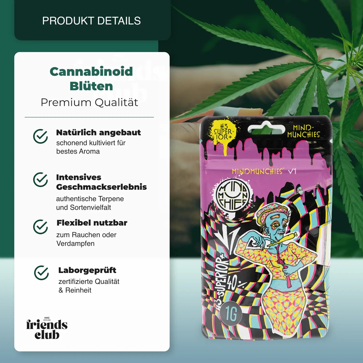 Mit der Sorte „V1“ setzt die Mind Munchies-Serie ein visuelles und aromatisches Statement. Die Kombination aus 40 % H3 Superior+ und einem auffälligen Design macht dieses Produkt zu einem echten Hingucker für Sammler und Liebhaber außergewöhnlicher Aromaprofile.