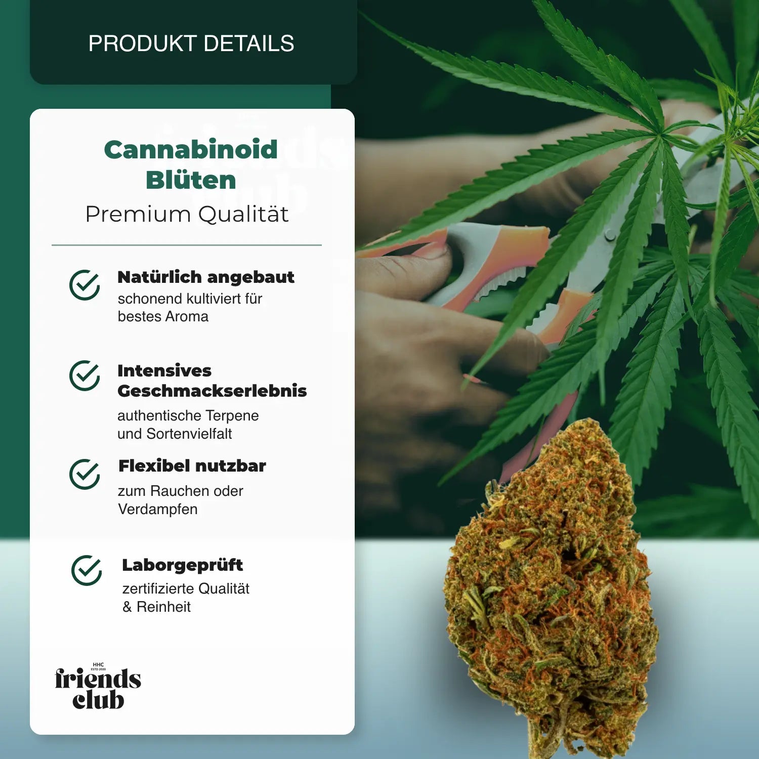 Die Blüte enthält einen hohen Anteil an PHCP (> 13 %) sowie einen sehr geringen THC-Gehalt von < 0,17 % und ist damit konform mit den gesetzlichen Vorgaben. Der CBDA-Gehalt liegt bei über 10 %.