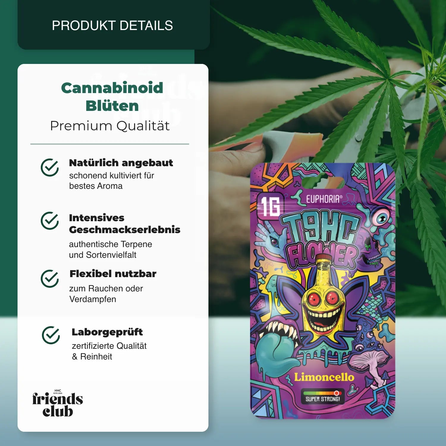 Die T9HC Blüten Limoncello verbinden intensives Zitrusaroma mit hochwertigem Cannabinoidprofil. Sie stammen aus EU-zertifiziertem Cannabis Sativa L. und wurden im Gewächshaus unter kontrollierten Bedingungen angebaut. Durch die Anreicherung mit 95 % reinem T9HC-Extrakt entfalten sie ein besonders starkes Aroma mit frischen, fruchtigen Noten – inspiriert vom bekannten Limoncello-Geschmack.