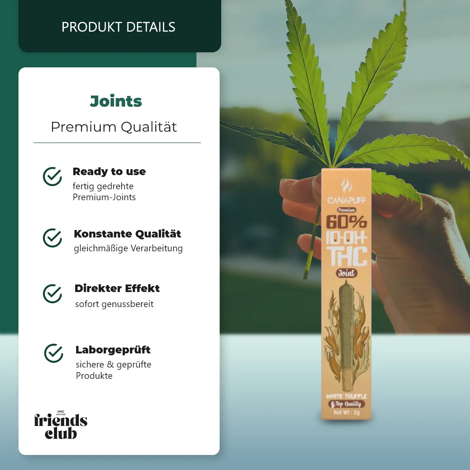 Erlebe mit dem White Truffle 60% 1O-OH-THC Joint ein unvergleichliches Geschmackserlebnis. Diese Sorte zeichnet sich durch eine einzigartige Kombination von salzigen und süßen Aromen aus, begleitet von einem kräftigen Duft. Beim Konsum erwartet dich ein komplexes Zusammenspiel von erdigem Moschus und frischen Zitrusnoten, die sich zu einem harmonischen Abgang vereinen – eine perfekte Mischung aus Peanut Butter Breath und GG4.