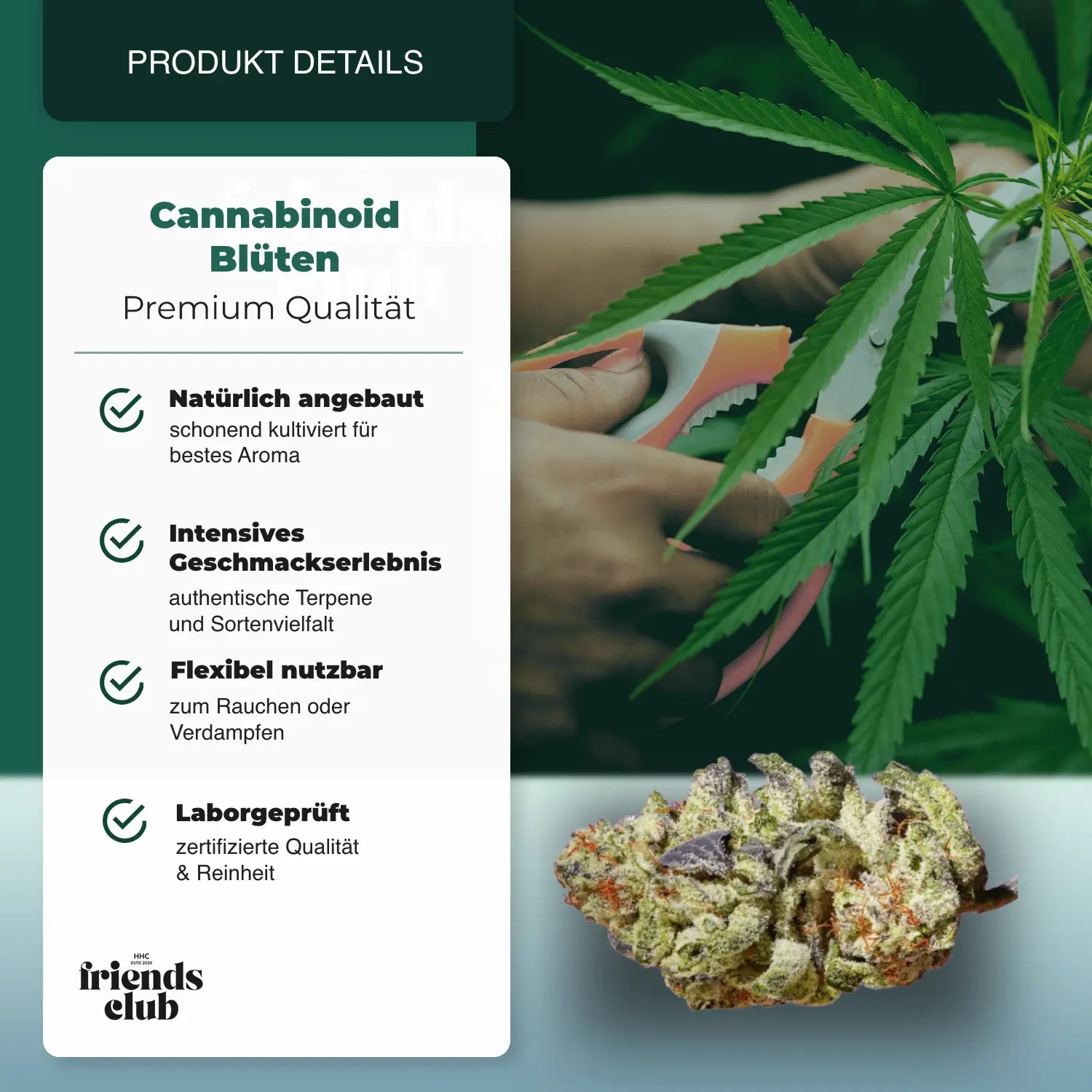Bitte beachten Sie die folgenden Hinweise: Setzen Sie die Blüten nicht direktem Sonnenlicht aus und bewahren Sie sie an einem trockenen Ort auf. Stellen Sie sicher, dass sie außerhalb der Reichweite von Kindern und Haustieren aufbewahrt werden. Der Verkauf ist ausschließlich an Personen ab 18 Jahren gestattet. Für Schwangere ist der Konsum verboten.