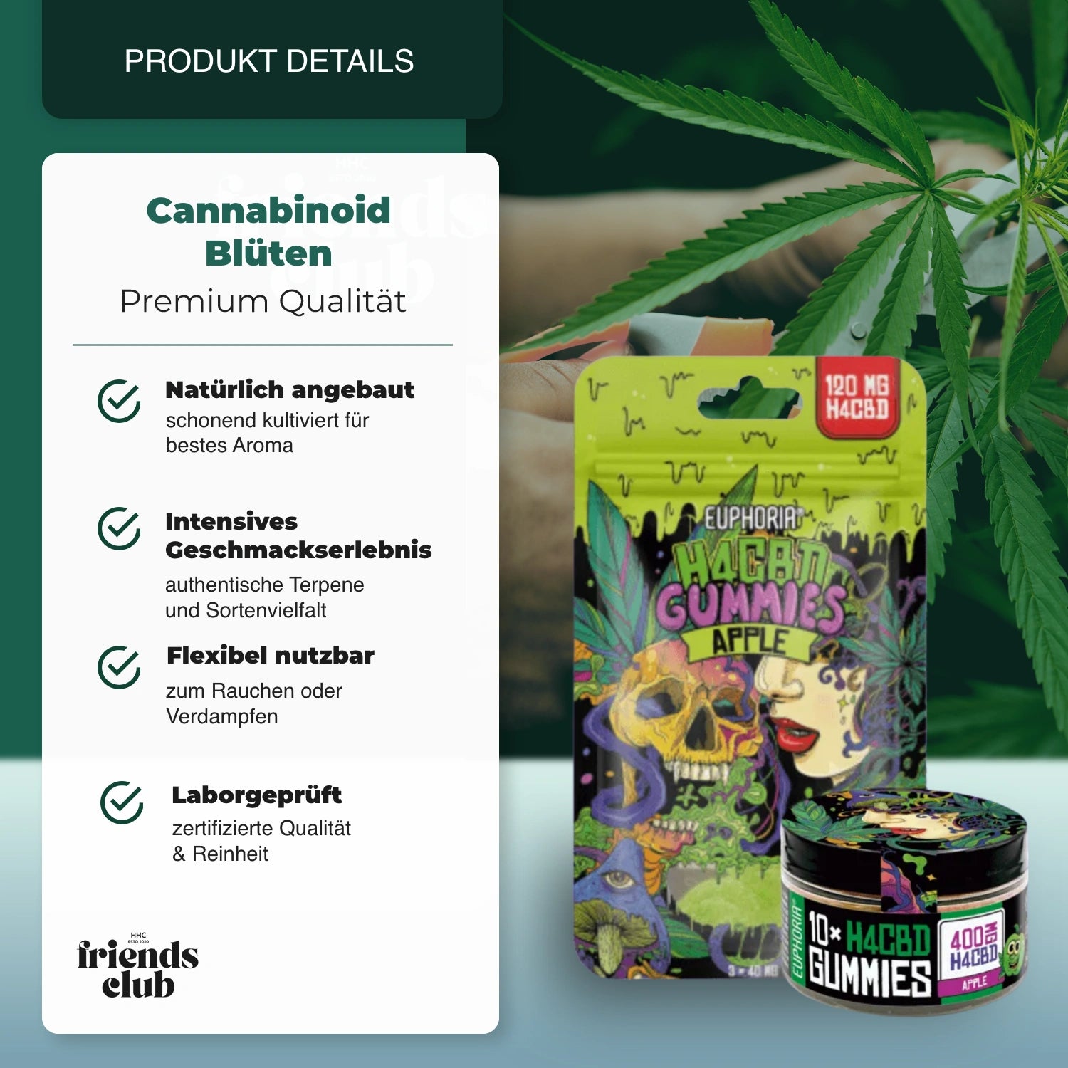 Diese H4CBD-Gummibonbons sind ausschließlich für Dekorations-, Aroma- (Apfel-Aroma) und Souvenirzwecke gedacht. Du solltest sie nicht verzehren. Jedes Gummibärchen enthält 40 mg H4CBD. Die Gummis enthalten kein THC.