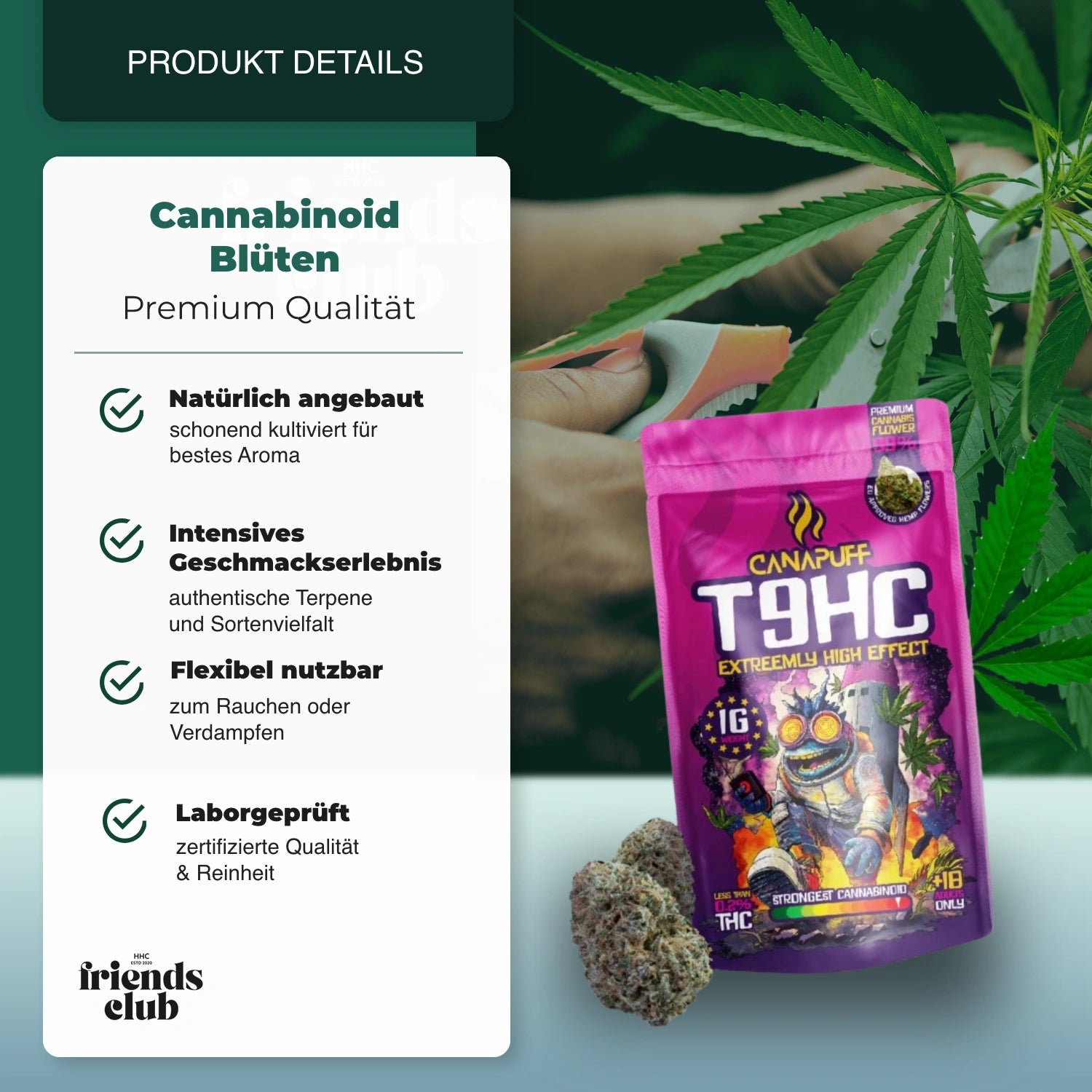 - Inhalt: T9HC Blüten (verschiedene Grammaturen je nach Auswahl)
